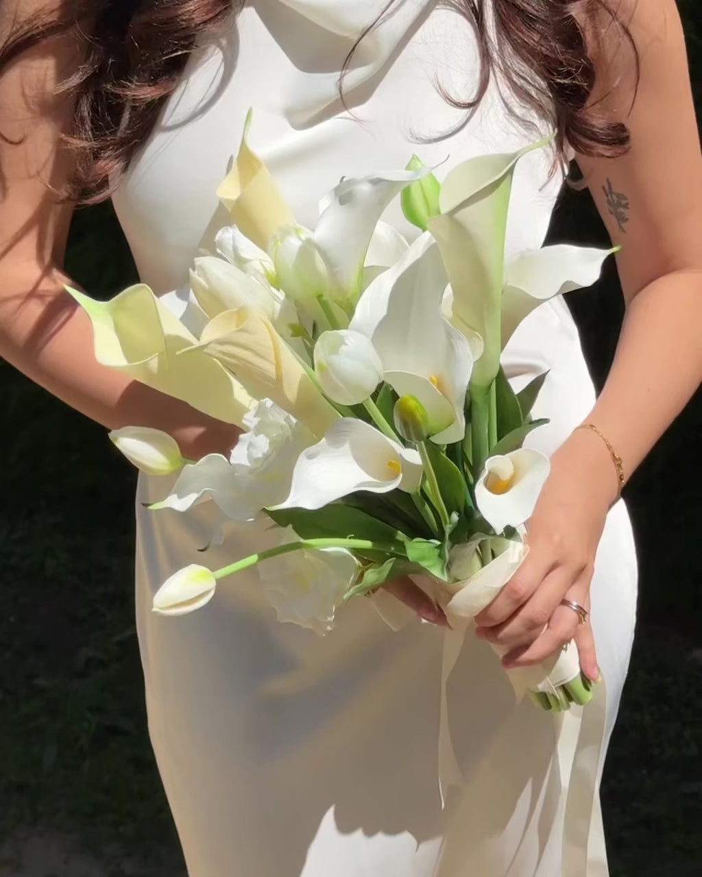 Materials: 100% real touch and silk flowers, satin ribbon on bouquet handle