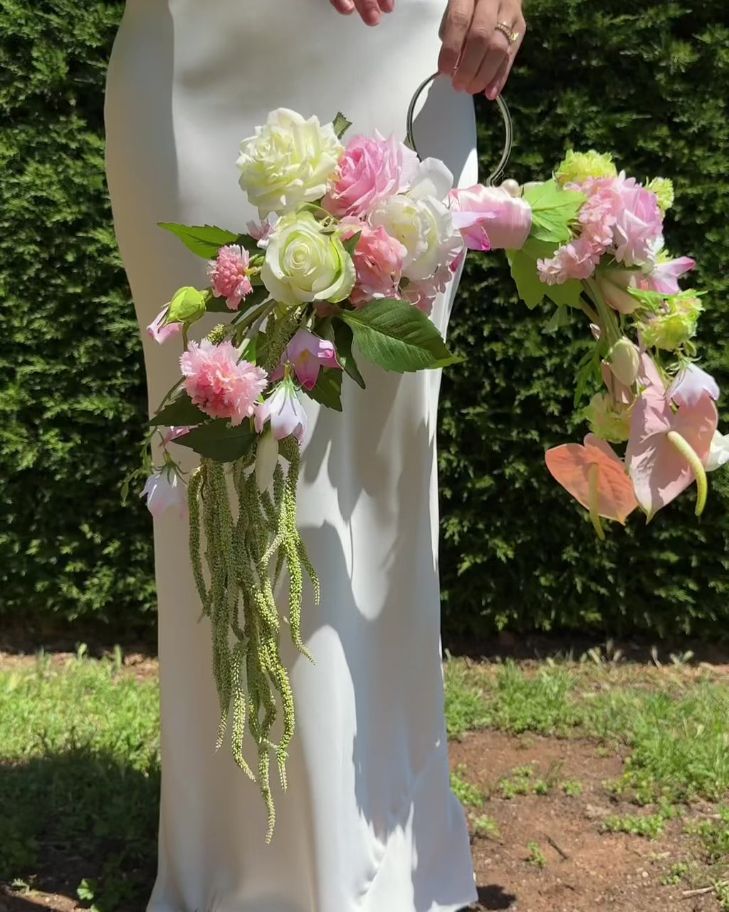 With the trendy hoop bouquet design, you can wear this bouquet in multiple ways. When you would like to hold hands with your partner AND hold a glass of champage - you can now do so while also carrying your bouquet elegantly on your arm. Having both hands free whenever you need. How good! How chic!