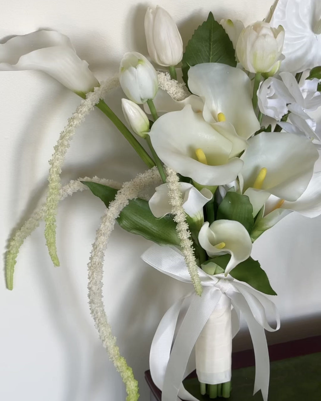 We value quality. That's why we used 100% real touch and silk flowers to create these bouquets. The bouquet handle is perfected with a white satin ribbon.